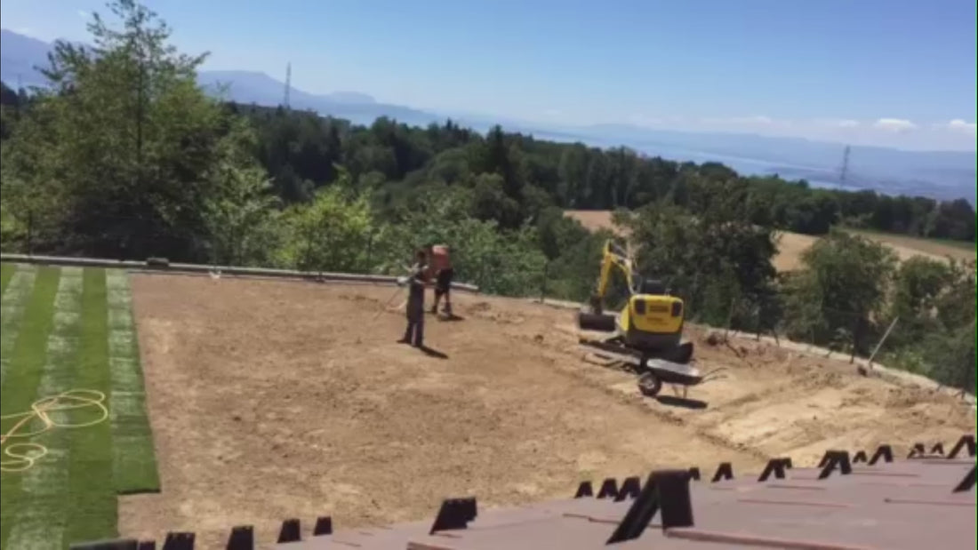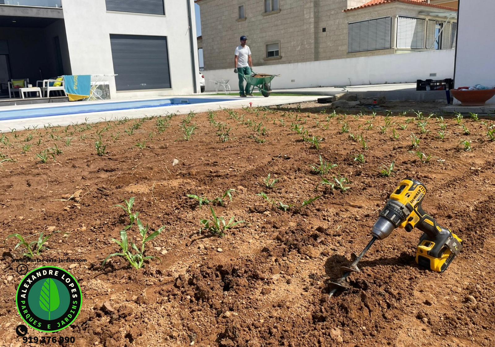 Aplicação de grama brasileira com a ajuda de uma aparafusadora com broca perfuradora para a terra
